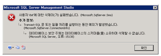 사용자를 삭제 하려고 하는데 Microsoft SQL Server, 오류:15138 오류가 났다.