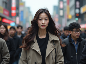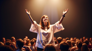 생성 프롬프트 :In the center of this image, a young woman stands on stage, her arms raised in a gesture of praise or worship. She is wearing a white blouse adorned with a floral pattern at the bottom and is standing against the backdrop of a lit-up stage with a black background. The lighting casts a soft …
